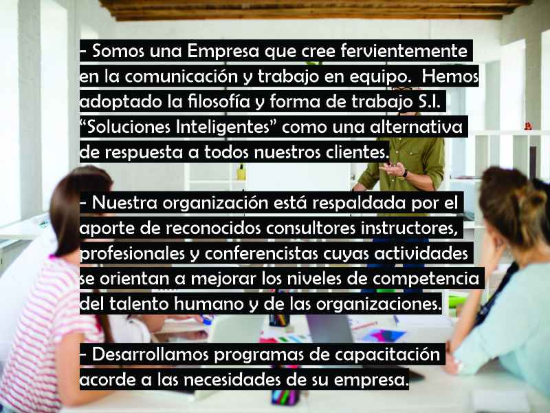 Somos una Empresa que cree fervientemente en la comunicación y trabajo en equipo. Hemos adoptado la filosofía y forma de trabajo S.I. “Soluciones Inteligentes” como una alternativa de respuesta a todos nuestros clientes. Nuestra organización está respaldada por el aporte de reconocidos consultores instructores, profesionales y conferencistas cuyas actividades se orientan a mejorar los niveles de competencia del talento humano y de las organizaciones.